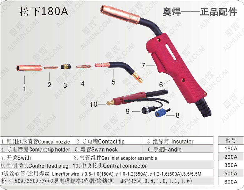 松下180/200A氣保焊槍(氣冷式)適用于:150A-250A氣保機,哲載率60%時焊機電流200A,使用焊絲直徑:0.8-1.2MM。相關產(chǎn)品:保護套,導電嘴,連桿,彎管,絕緣螺母等。